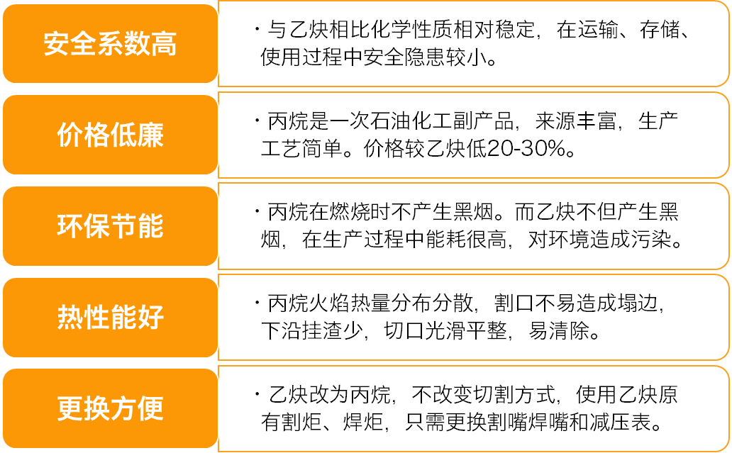 在切割焊接等工藝中,丙烷和乙炔都是常用的可燃?xì)怏w。然而在具體實(shí)踐中,丙烷因其安全、綠色、高效、性價(jià)比高等特點(diǎn),逐漸成為工業(yè)用戶的首選氣體,大有取代乙炔之勢。與乙炔等氣體相比,丙烷具有多種優(yōu)勢: